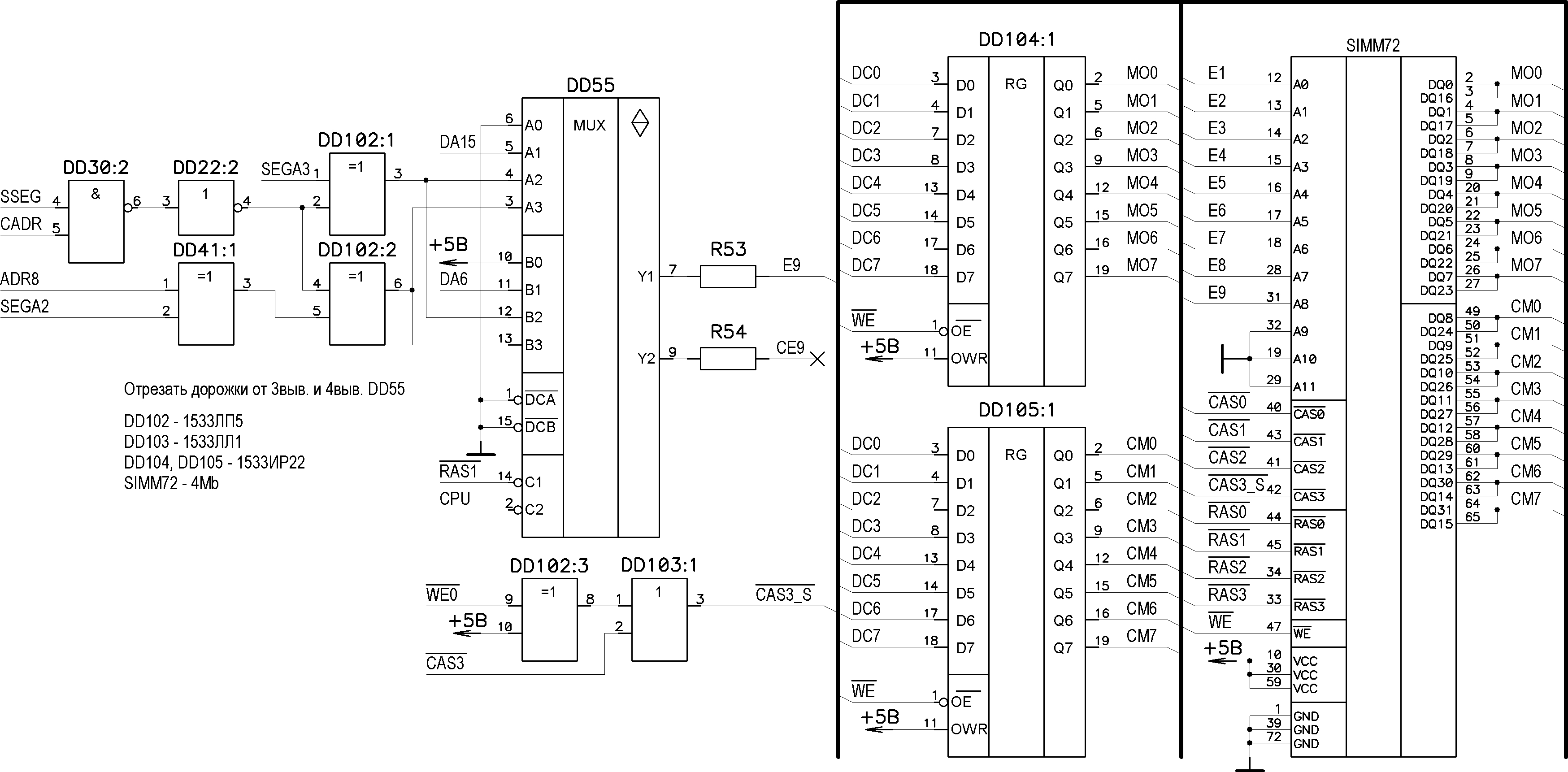 Приветствую! Решил поднять тему. Перерисовал принципиальную схему c отсканированых черновиков нольки под использование памяти 1мб SIMM72... Кое что на листках было несовсем ясно, а если быть точным на листке с узлом формирования /CAS3_Simm. На входы элемента исключающее "ИЛИ" приходят два(?) сигнала - один WE0, второй непонятный, под черным прямоугольником, он явно был вырезан... вот на этом листке - download/file.php?id=533 . Нолька, я пока нарисовал перемычку, если будет возможность проверь правильность схемы доработок, а особенно узел формирования /CAS3_Simm. Спасибо заранее!