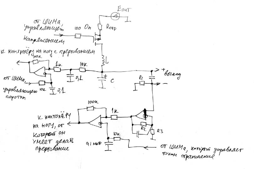 Да, забыл нарисовать на схеме, выходное напряжение надо подавать на компаратор, предварительно поделив его, т.к. ШИМ в контролёре, наверно, ниасилит выдать более 5В. И по поводу включения мосфета - нарисовал первое, что в голову пришло, лучше еще покурить доки, там обычто нечто более оригинальное придумывают. Да, и еще диод шоттки поставить, чтоб мосфет не умер от эдс самоиндукции!!!