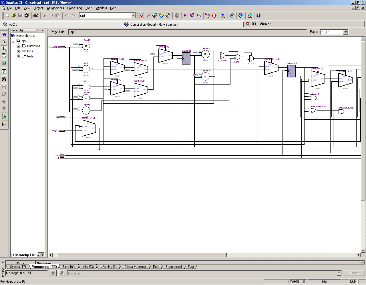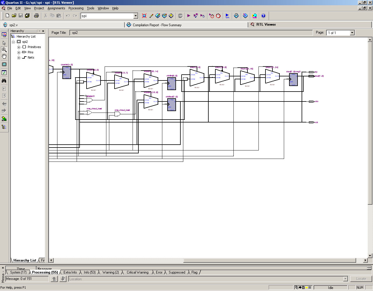 Компильнул spi2 из ZXEvo, там так же как и у меня, Q7 регистра подключен к sdo, т.е. на MOSI будет то что осталось в регистре. А вобще в RTL Viewere получается мозговзрываная картинка