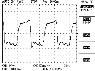 Zhizh wrote:а почти синусоидальные, а во-вторых, имеют амплитуду 1,6 В, что вроде как маловато. Частота 14,28 МГц (столько намерял осциллограф DS-1100 EZ Digital). 8 Мгц, выдаваемые этой же DD1, имеют амплитуду около 3 В, тоже синусообразные.