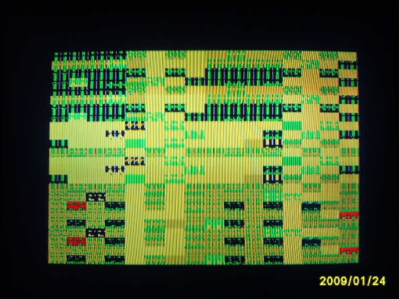 После всяческих манипуляций, осмысленной замены пары микросхем и нескольких вслепую, устранения двух закороток наконец-то имею хоть какое-то изображение в рабочей области экрана: