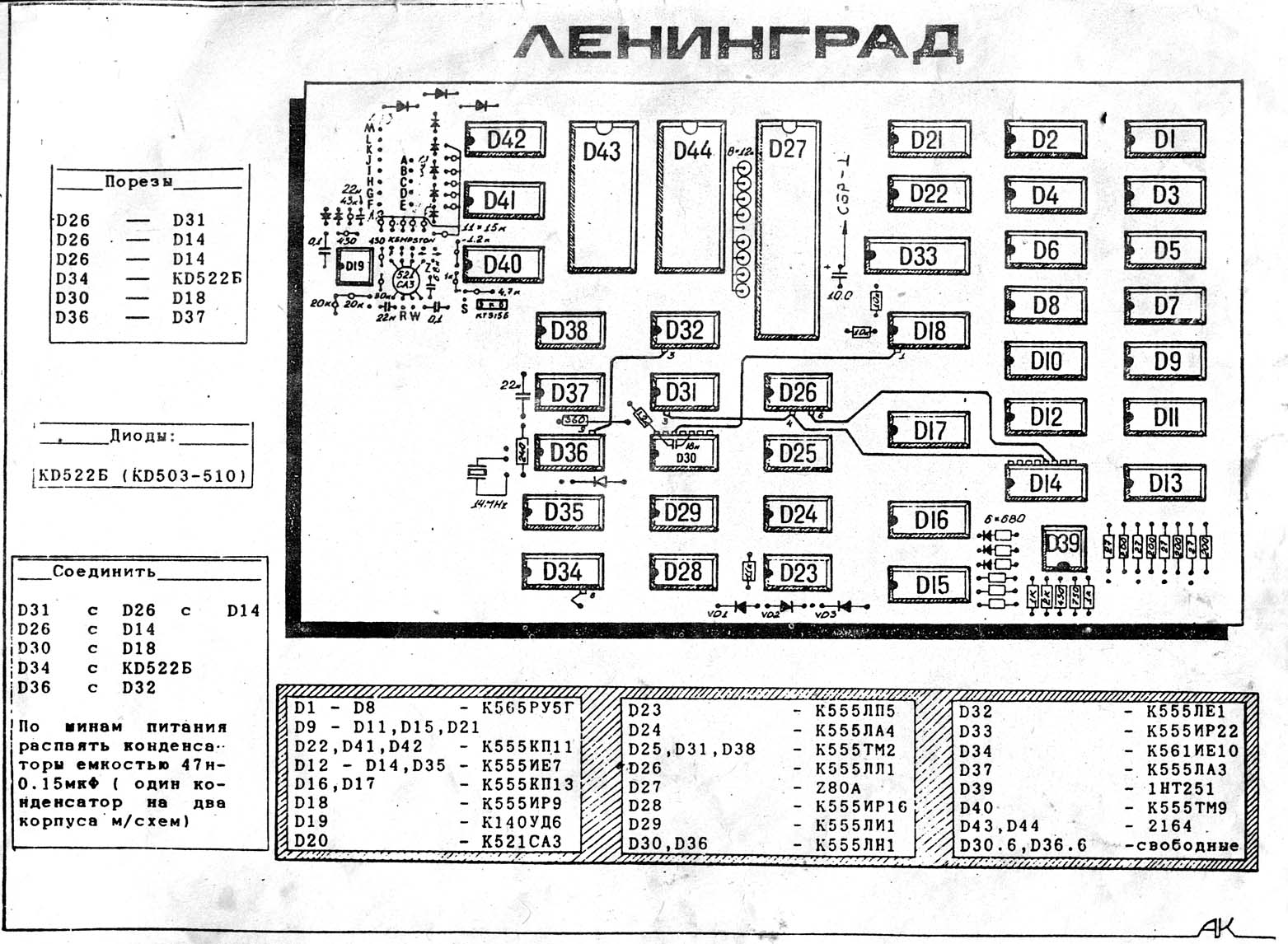 Ниже прилагается список найденных ошибок (только для плат "Ленинграда" от JTN, где стоит год выпуска 1989) и принципиальная и монтажная схемы, отсканированные с хорошим качеством, которые нигде, кроме этого форума, найти не получится. Такой вот эхсхлюзивчег от koe smile