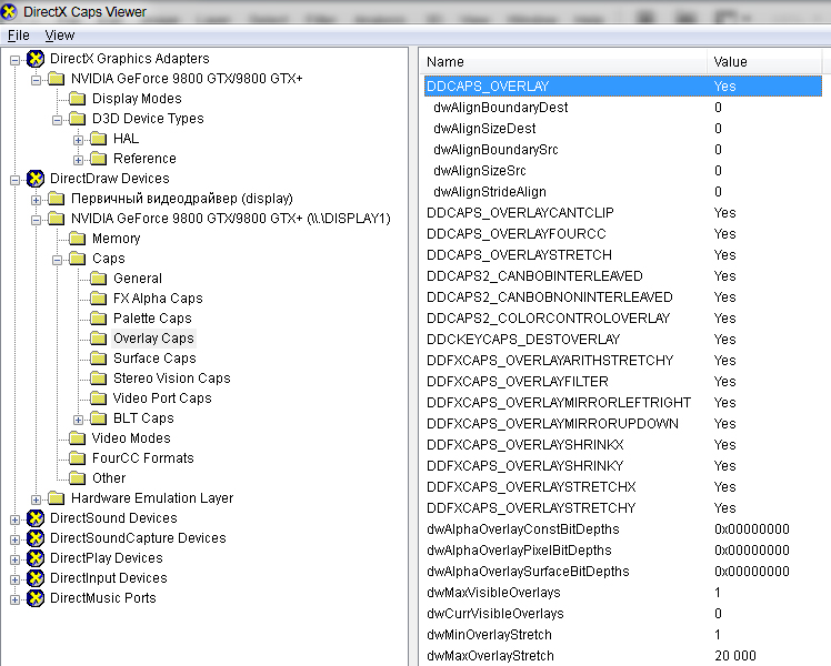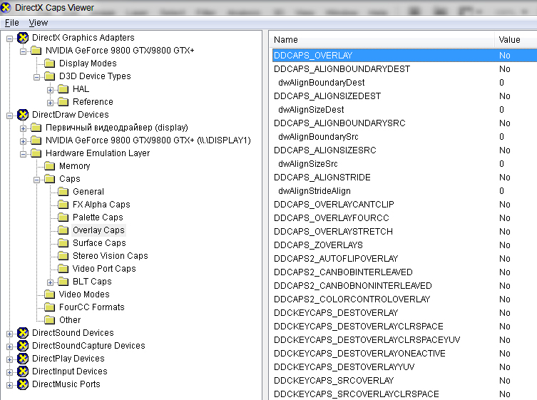Например если смотреть ветку NVIDIA GeForce 9800 GTX/GTX+, то в ней как бы есть DD_CAPS_OVERLAY