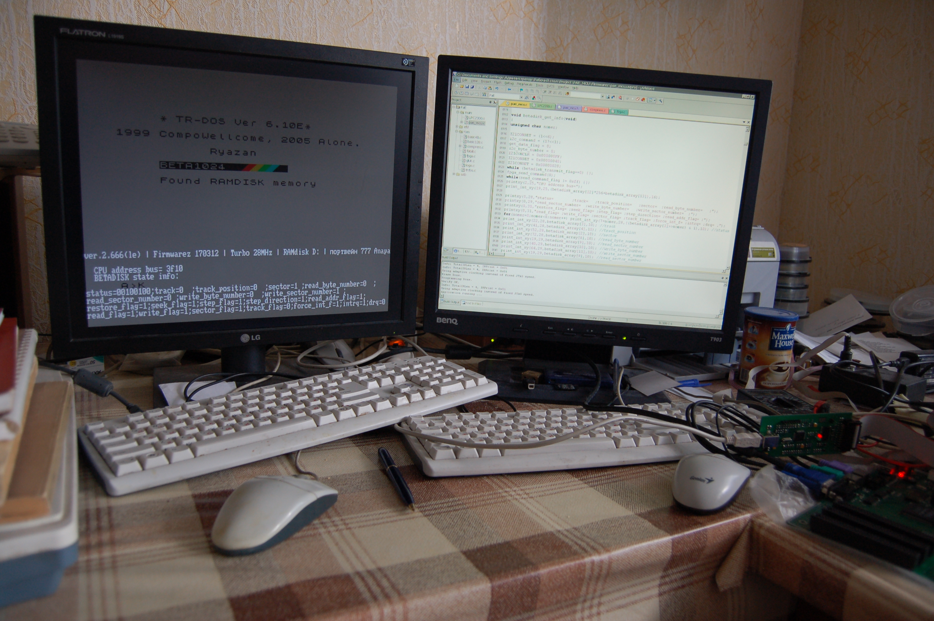 Ковыряясь с бетадиском, столкнулся с необходимостью наблюдать состояние его внутренних регистров, причем с перехватом обращений z80 к нужным адресам (дебажение через fpga-шный jtag эту проблему не решает). Возникла идея реализовать сабж в упрощенном виде, благо возможности платы 2.666 позволяют почти любые извращения. Посидел пару дней, сделал визуализацию внутренностей бетадиска и возможность отановки проца, чтобы можно было успеть что-то отследить. Загорелся идеей сделать автоматический аппаратный перехват брейкпоинтов и пошаговую трассировку, что теперь уже стало несложно, на фоне всего сделанного. Как бы сделать еще и дизасм, чтобы видеть исходный код? Тогда будет практически анрыл в железе :)