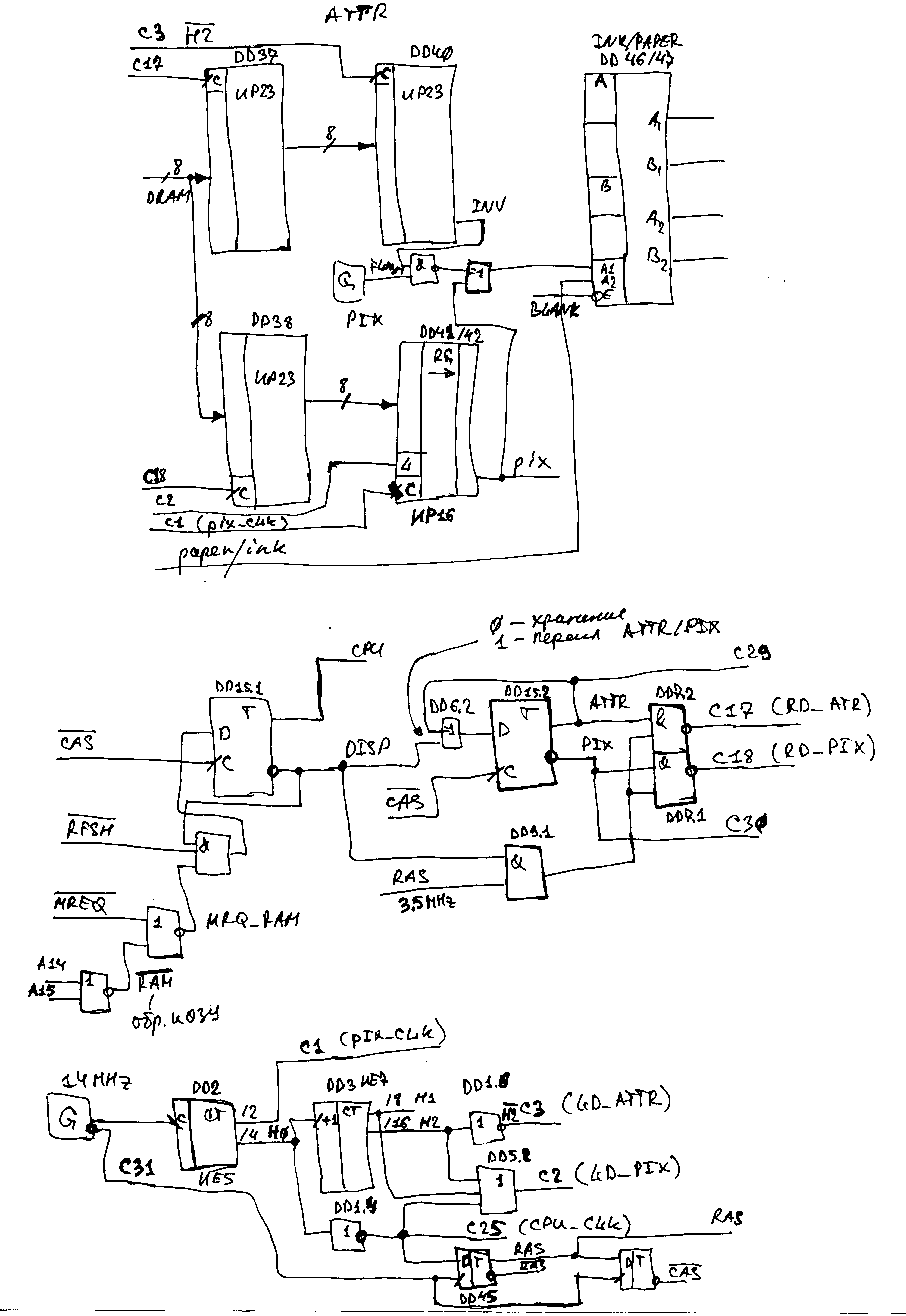 Вот схема и результаты моделирования. На временн́́о́й диаграмме четко видно, что пиксели всегда читаются до атрибутов, хотя фазовые соотношения сигналов меняются, но случая когда атрибуты читаются перед пикселями никогда нету. Можно сделать более детальное моделирование, где будет работать реальная программа а не rst 38. Если процессор к памяти не обращается, то сигналы C17 и C18 распределены равномерно и их фазовые соотношения не меняются.