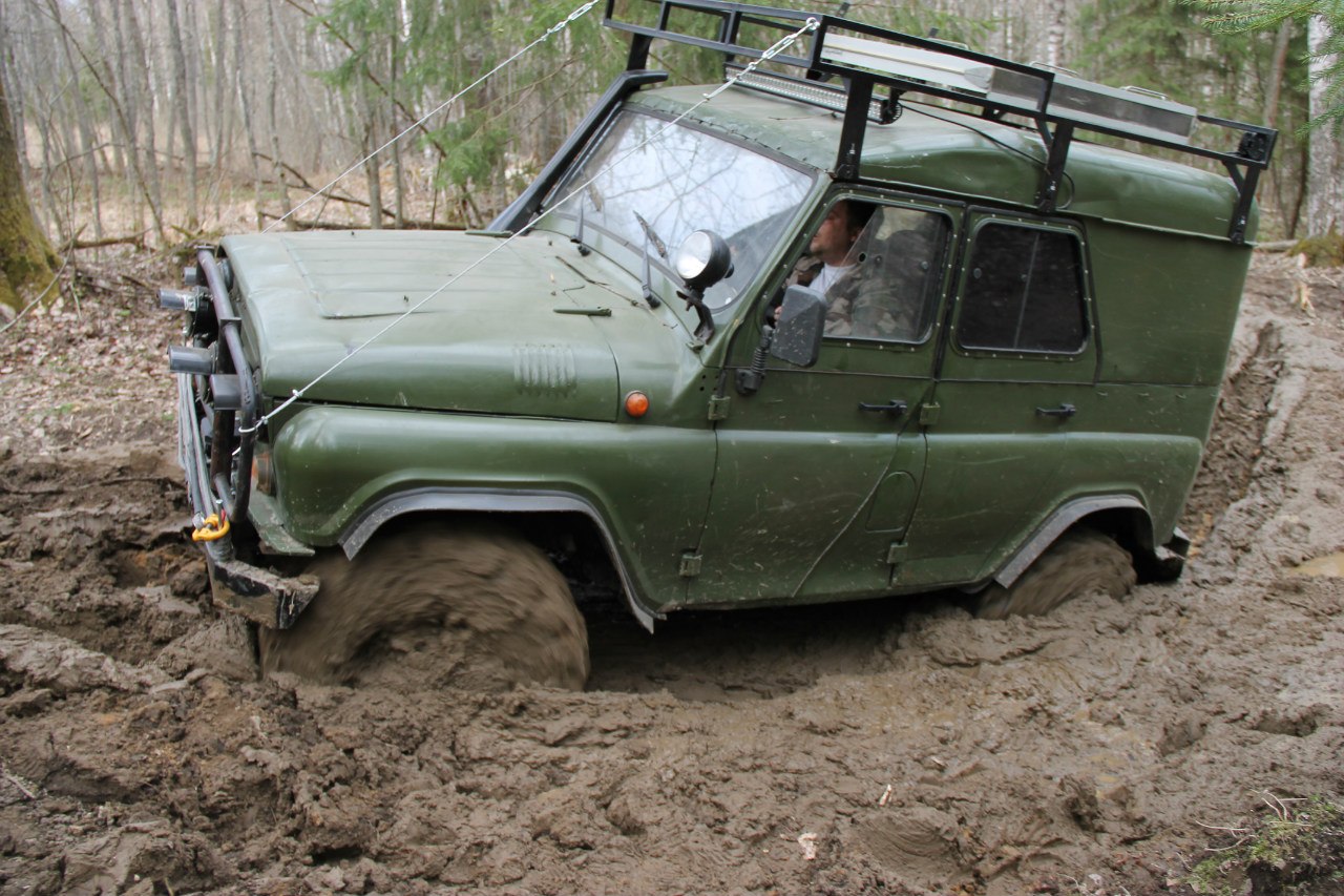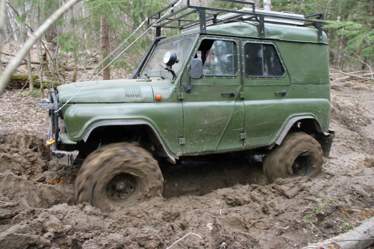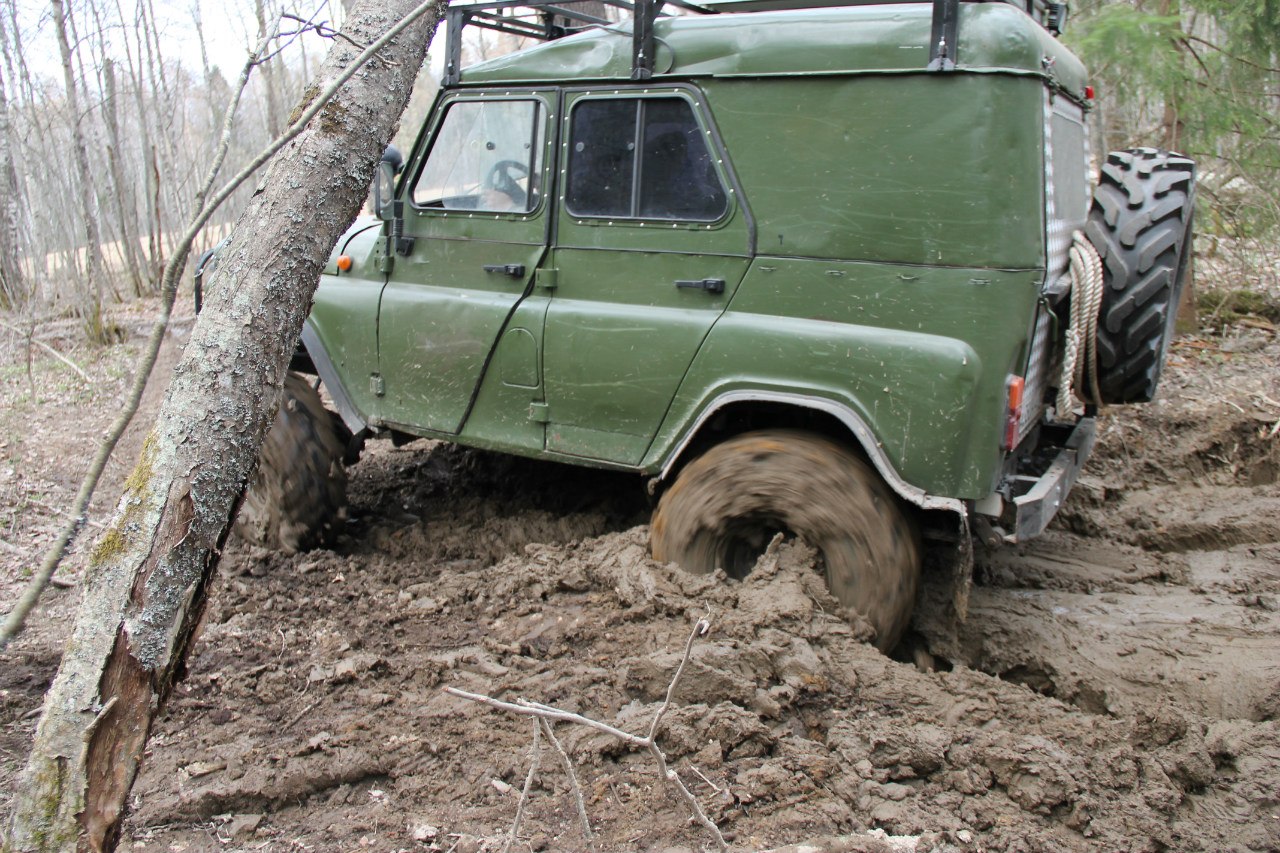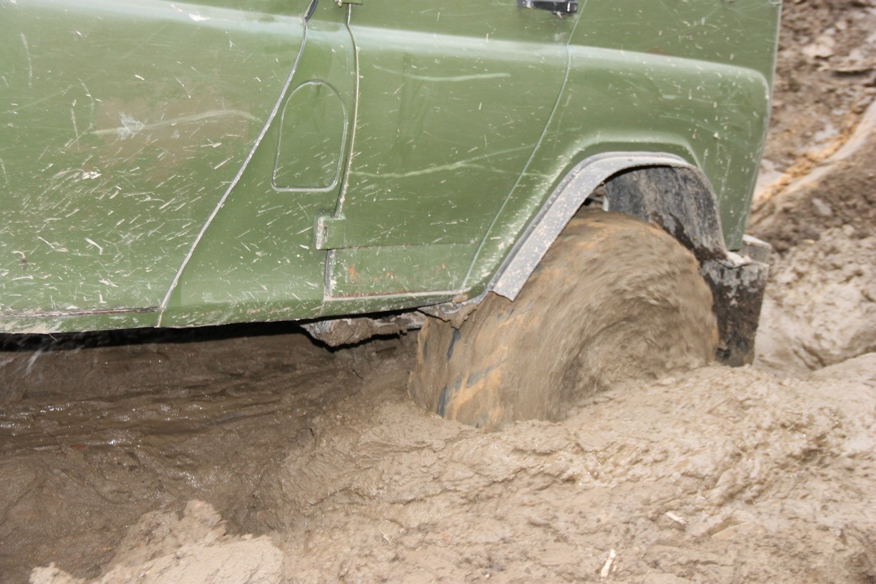 Рядом шел патруль длинный на 36ых крокодилах. Крокодилы на узком 8ом диске были больше белки на дюйм-полтора. Так вот, он был плотно залит грязью по всему перимеру до крыши. Потому что брал препятствия только с разгона, бешенно вращая колесами и поднимая фонтаны говна.