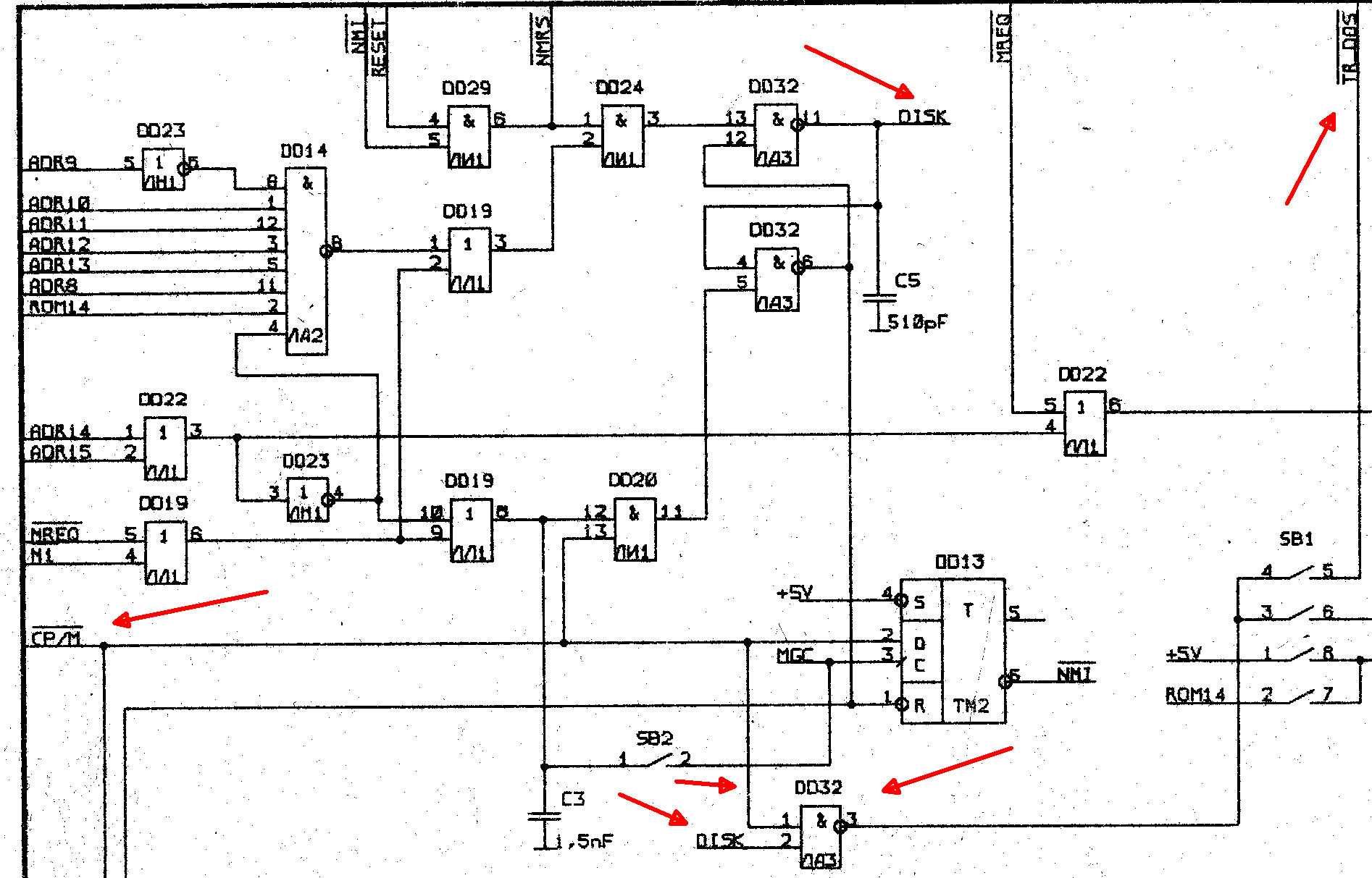 Да, там примерно также, но нет узла на ла3 DD32. Блокировка (или принудительный перевод сигнала /TR-DOS) от сигнала /CPM всё же есть и в 3.2 и в 5 - это принудительный сброс триггера трдос сигналом /CPM. в 3.2 сигнал /CPM заходит сразу на триггер, собранный на ла1, в 5й версии /CPM сбрасывает триггер трдос через ли1 DD20.4, но в 5й версии Профи сделали еще и узел на DD32. скорее всего была задержка на переключение триггера трдос и были какие-то иголки.